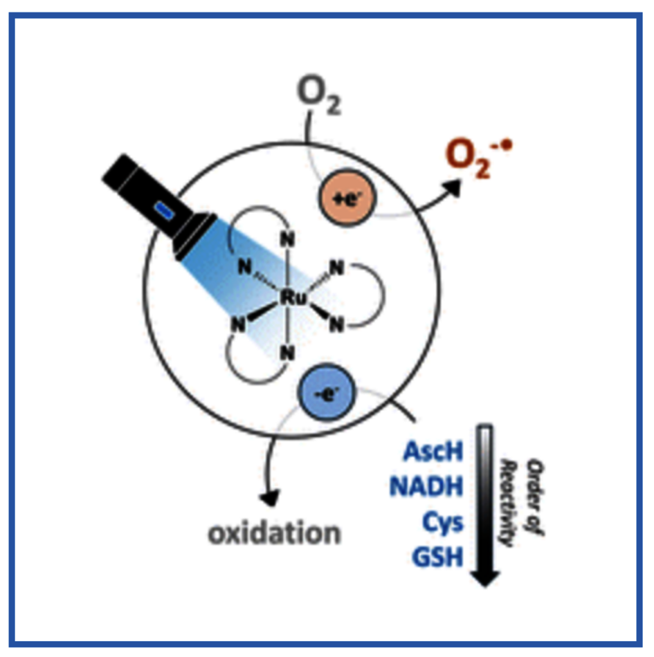 Ru complexes are widely studied in photodynamic therapy. The type I mechanism of action is based on a photoinduced electron transfer from the complex to O2 and needs an electron donor to be catalytic. Little is known about electron donors among physiologically relevant compounds. Hence, we investigated the oxidation of ascorbate, NADH, cysteine, and glutathione with the canonical [Ru(bpy)3](PF6)2 as well as a derivative with a peripheral disulphide unit, [Ru(S–Sbpy)(bpy)2](PF6)2. The established reactivity order is ascorbate > NADH ∼ cysteine > glutathione.
