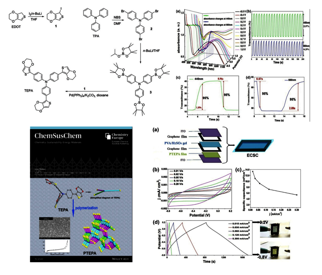 A new green synthetic route to tris[4‐(3,4‐ethylenedioxythiophene)phenyl]amine (TEPA) monomer has been developed and the molecular structure of TEPA has been determined by using single‐crystal XRD. Solution‐processable nanoporous poly{tris[4‐(3,4‐ethylenedioxythiophene)phenyl]amine} (PTEPA) is prepared by a chemical oxidative polymerization in a microemulsion. Based on the distorted structure of TEPA in the solid state, it is proposed that dendritic PTEPA has a distorted 3 D conformation with multiple twisted channels and pores that are narrowed and blocked by bifurcation and distortion of PTEPA, which is consistent with the observed hierarchical pore structure. As a cathode material, PTEPA exhibits a discharge capacity of 89.5 mAh g−1 in the initial cycle with a highly sloping two‐stage discharge curve and relatively stable cycling performance. Beyond its excellent energy storage properties, PTEPA also shows relatively good electrochromic performance. Furthermore, an efficient all‐solid‐state electrochromic supercapacitor (ECSC) with good electrochromic performance and high energy storage capacity (13.3 mF cm−2) is assembled from PTEPA and nanoporous graphene films. During charge–discharge processes, the color of the ECSC changes between yellow‐green and steel blue. Thus, the energy storage level of the ECSC can be monitored by the corresponding color changes. The fabricated ECSC may have practical applications, for example, in self‐powered electrochromic smart windows.