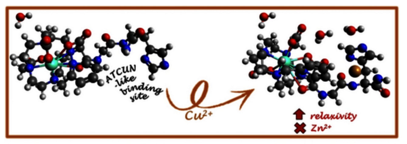 Gd3+ complexes bearing a bioinspired Cu2+-binding site derived from ATCUN are studied as MRI contrast agents. The presence of two amino acids (GH) is necessary to bind Cu2+ and trigger a relaxivity increase. This is due to a higher number of H2O retained close to Gd3+ through H-bonding with Cu2+. Remarkably, the system remains selective for Cu2+ vs Zn2+.