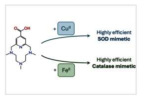 The failure of the therapeutic administration of superoxide dismutase (SOD) and catalase (CAT) enzymes to prevent oxidative stress has fostered the development of metal complexes that are capable of mimicking their activity. In the present work, two new pyridine azacyclophane ligands capable of coordinating Cu2+ and Fe2+ to give rise to mimetics with high activities toward disproportionation of the superoxide anion or hydrogen peroxide, depending on the metal ion, have been prepared. Although the Cu2+ complexes have some of the highest SOD activities reported to date, they are completely inactive toward H2O2 disproportionation. In contrast, the Fe2+ complexes catalyze the disproportionation of H2O2 without showing any catalytic SOD activity. Therefore, the type of antioxidant activity of these macrocycles is dictated by the nature of the metal ion, which represents a new approach to the development of potentially useful mimetics.