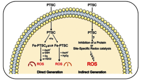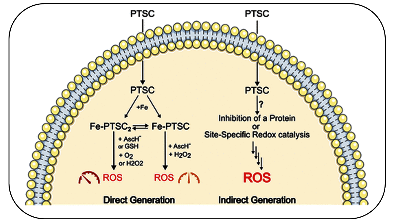 α-N-Pyridylthiosemicarbazones (PTSC) are anticancer agents that can induce oxidative stress in cells, likely through interactions with metal ions. Redox-active Cu and Fe bind strongly to PTSC, forming complexes Cu-PTSC and Fe-PTSC2. These complexes have been proposed to directly catalyze the formation of reactive oxygen species (ROS) and deplete key cellular reductants, thereby exerting oxidative stress. Alternatively, oxidative stress could also arise indirectly through interactions with other cellular targets. Evaluating catalytic rates could help distinguish direct from indirect mechanisms, as ROS production should outpace antioxidant defenses. In this respect, the catalytic activity of the Fe complexes of two PTSCs, Triapine (3AP) and Dp44mT, with the two most abundant reducing agents, ascorbate and glutathione, was evaluated under aerobic conditions. Fe-3AP2 and Fe-Dp44mT2 showed very low catalytic activity in depleting GSH/ascorbate and producing ROS (<4 turnovers per hour). Higher activity appeared with H2O2 and ascorbate, but only for 1:1 Fe-PTSC complexes, not 1:2 Fe-PTSC2. Competition assays with H2O2-degrading enzyme catalase revealed that Fe-PTSC reacted 3 orders of magnitude slower than the enzyme. Thus, Fe-PTSC and Fe-PTSC2 are unlikely to drive ROS production through a direct mechanism. Instead, an indirect mechanism or a site-specific ROS production appears to be more plausible.