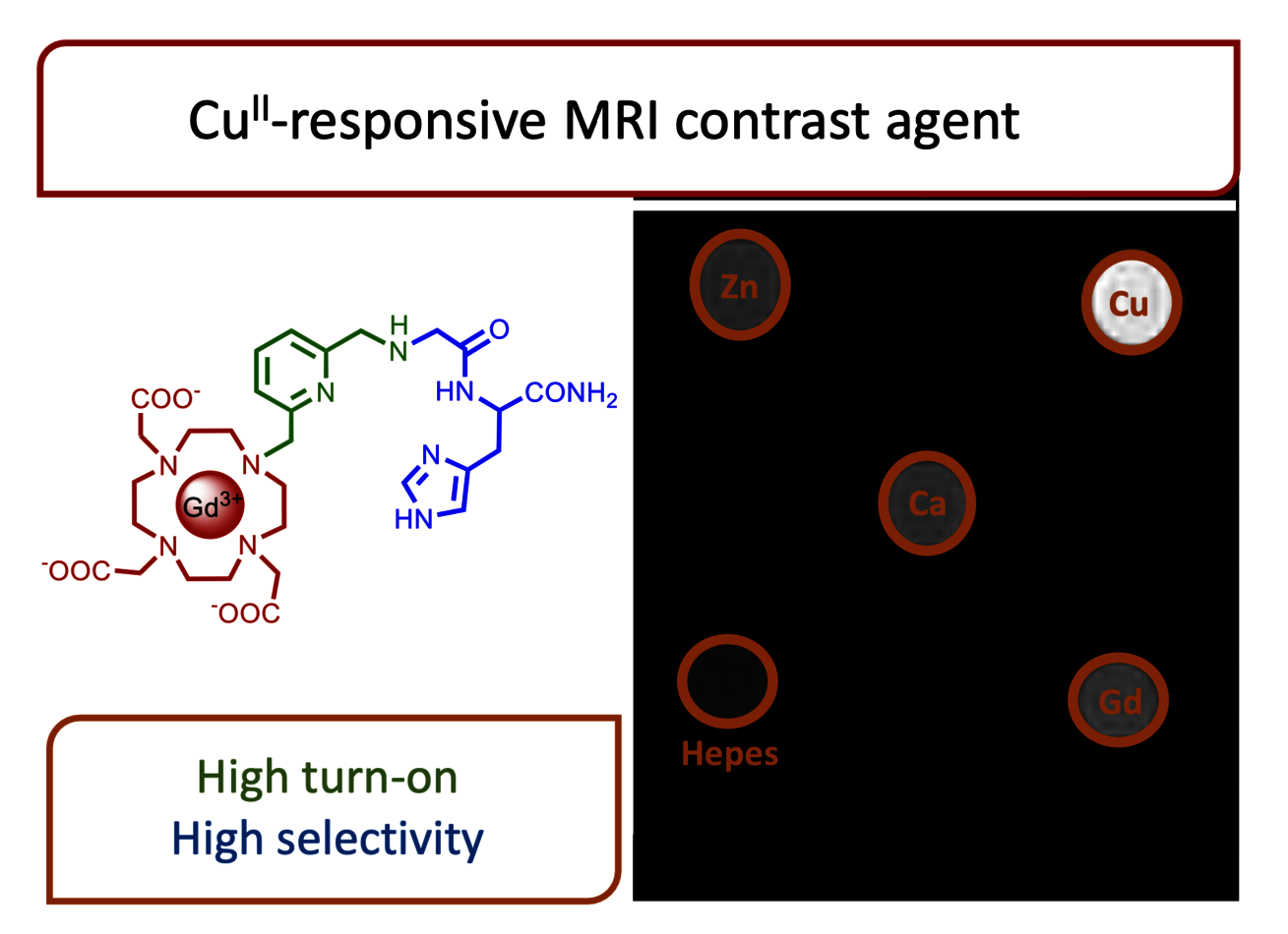 Imaging extracellular Cu2+ in vivo is of paramount interest due to its biological importance in both physiological and pathological states. Magnetic resonance imaging (MRI) is a powerful technique to do so. However, the development of efficient MRI contrast agents selective for Cu2+, particularly versus the more abundant Zn2+ ions, is highly challenging. We present here an innovative Cu2+-responsive MRI contrast agent that contains a bioinspired Cu2+ binding site. This sensor shows a remarkable increase in relaxivity of nearly 400% in the presence of Cu2+, which could be rationalized in terms of an increase in the hydration number of the Ln3+ ion, as demonstrated by spectroscopic and relaxometric studies and supported by density functional theory calculations. Importantly, the system also shows an unprecedented selectivity for Cu2+, in particular over Zn2+. Phantom MRI images were recorded at 9.4 T to highlight the potential of such probes, which lies directly in their bioinspired design.
